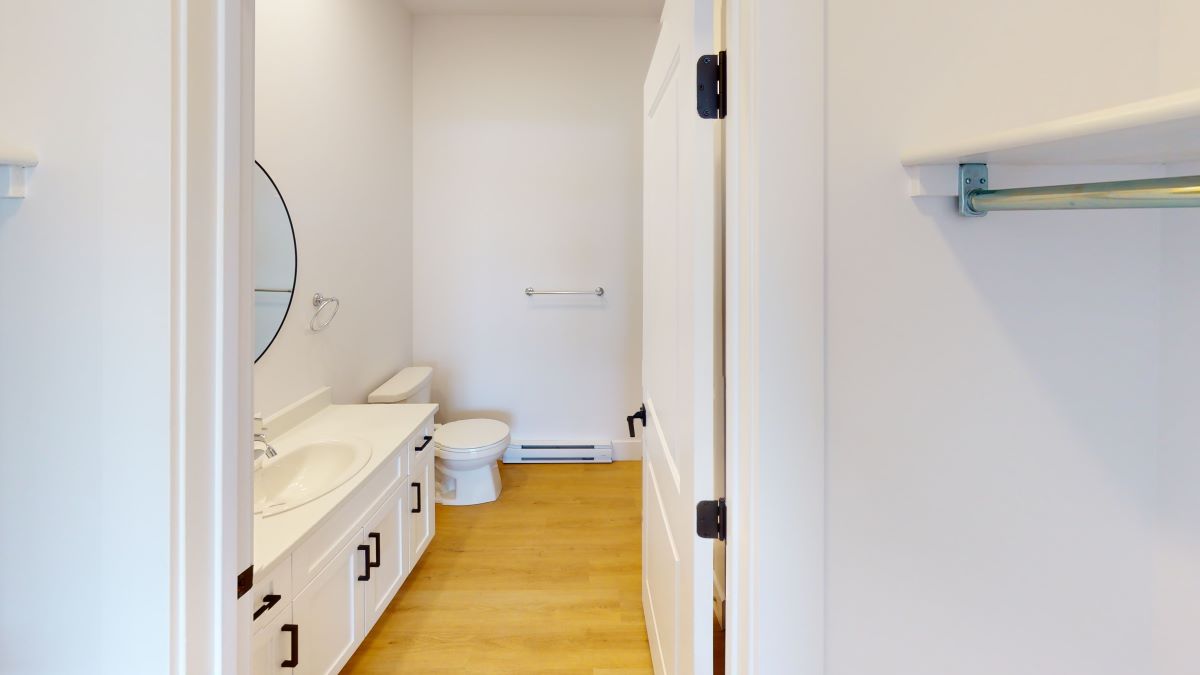 -Chantilly Lace white walls, white shaker cabinets and vanities